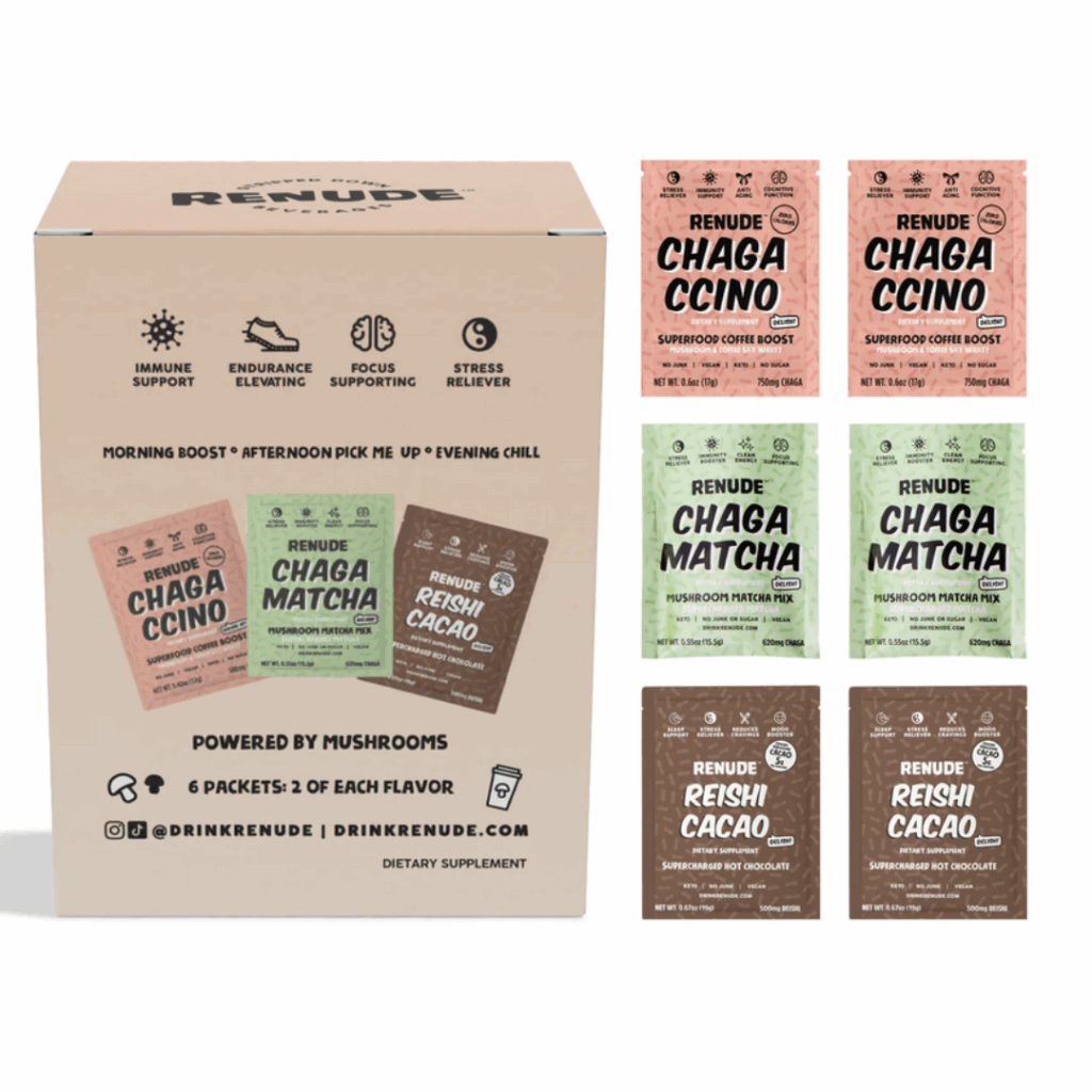 Mushroom coffee combines the familiar kick of coffee with the benefits of medicinal mushrooms like lion’s mane, chaga, and reishi. These fungi are rich in antioxidants and adaptogens, known to support immune function, brain health, and stress resilience. Renude Mushroom Coffee is a cult favorite, combining organic coffee with powerful functional mushrooms to provide steady energy and enhanced focus, without the usual coffee jitters.